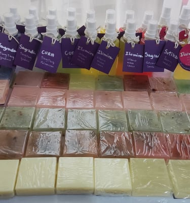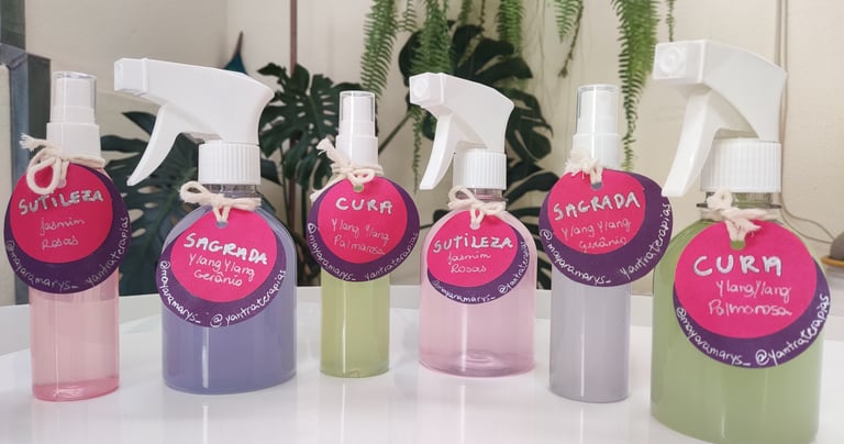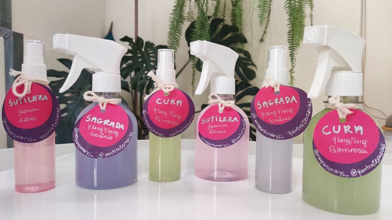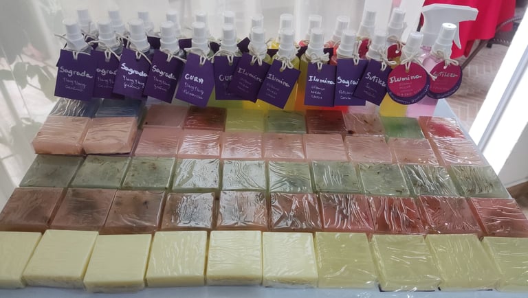 Sprays vibracionais e sabonetes terapêuticos para bem-estar integral.